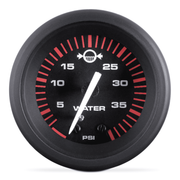 Black dial, red graduations, white numerals, vivid white pointer staff. Scratch resistant curved glass lens with black near-flush bezels. Perimeter and thru-dial lighting.