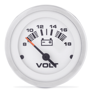 White dial, black numerals, black pointer with fire-orange tip. Scratch resistant curved glass lenses, with polished stainless steel, near-flush bezels. Optional add-on eyebrow or square bezels available (see Gauge Accessories for details). White perimeter and red thru-dial lighting.